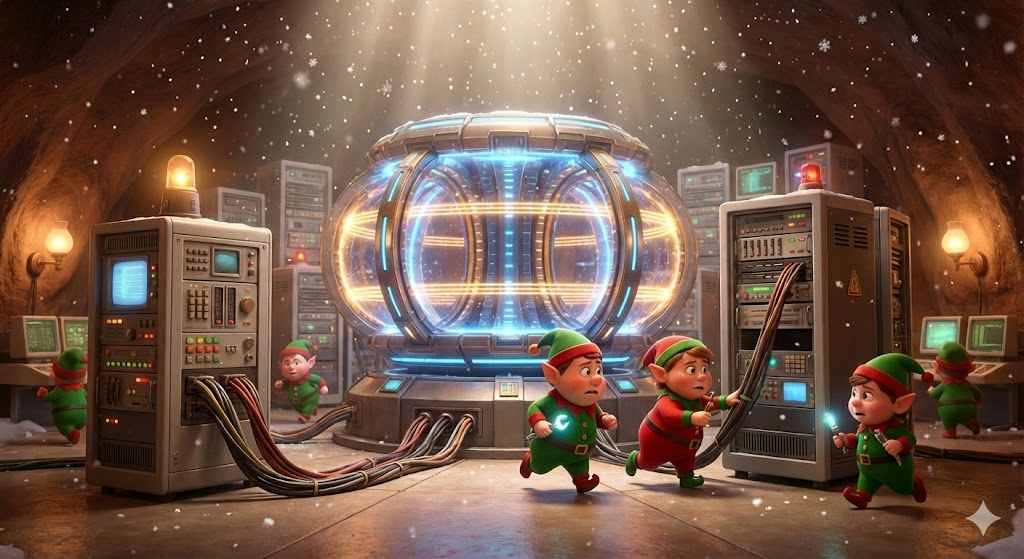 Climbing down the ladder, you discover the source of the beeping: a large, toroidal reactor which powers the factory above. Some Elves here are hurriedly running between the reactor and a nearby server rack, apparently trying to fix something.