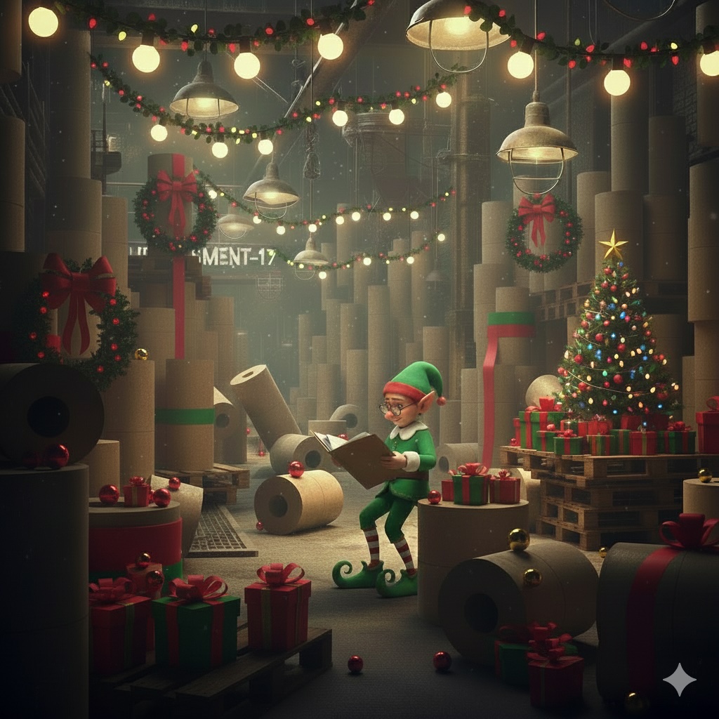 You ride the escalator down to the printing department. They're clearly getting ready for Christmas; they have lots of large rolls of paper everywhere, and there's even a massive printer in the corner (to handle the really big print jobs).